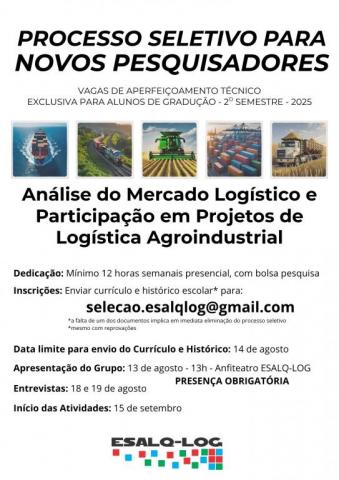 O Grupo de Pesquisa e Extensão em Logística Agroindustrial (Esalq-Log) está com inscrições abertas para vagas de novos pesquisadores para aperfeiçoamento técnico para análise de mercado logístico e participação em projetos de logística agroindustrial.